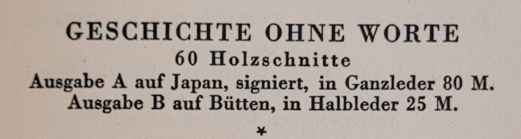 Masereel’s wordless novel, Geschichte Ohne Worte (Story Without Words) was published by Kurt Wolff in a limited edition of 800 copies, printed from the original wood blocks.